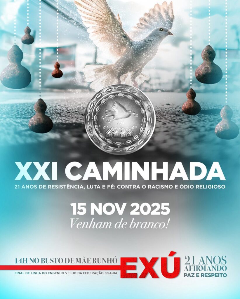 Em sua 21ª edição, a Caminhada Pela Paz, Pela Vida e Contra o Racismo Religioso convoca toda a sociedade a dizer basta à violência, à intolerância e a todas as formas de preconceito. O evento, organizado pelos terreiros do Engenho Velho da Federação, desde 2003, reafirma o compromisso com o diálogo inter-religioso e o respeito às diversidades culturais e religiosas que formam o Brasil.