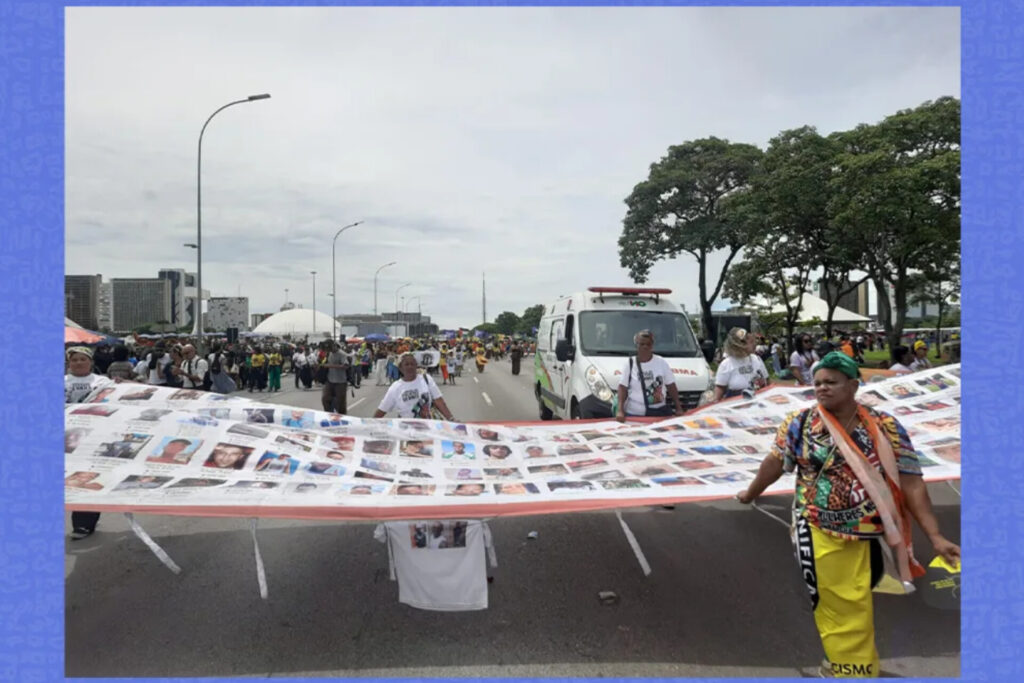 Mulheres da Mães da Maré seguram bandeira com fotos de 178 jovens vítimas da violência policial durante Marcha das Mulheres Negras. Crédito: Jane Fernandes