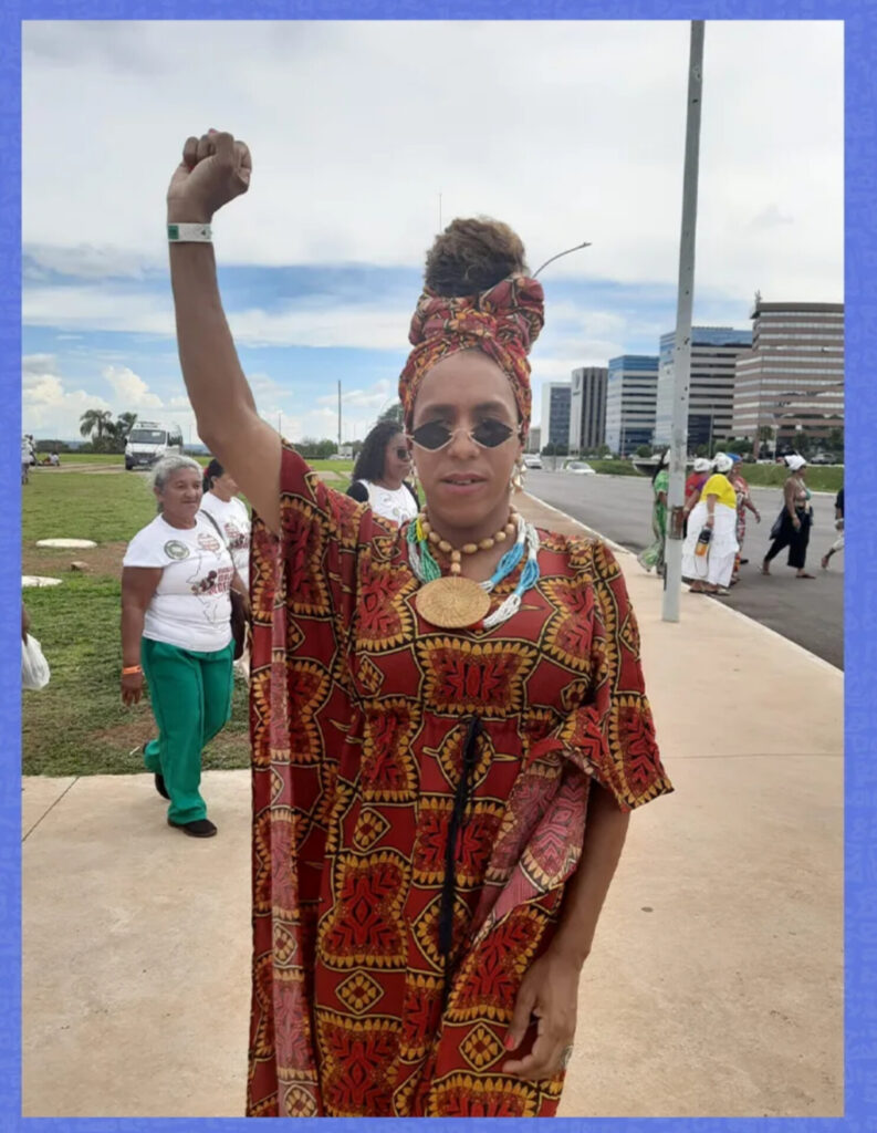 A violência também atinge corpos como o de Natasha Constantino, de 31 anos, mulher travesti que saiu de Aquidauana, no Mato Grosso do Sul, para mostrar uma narrativa de potência na 2ª Marcha das Mulheres Negras. Primeira mulher travesti empreendedora de moda autoral no seu estado, quilombola e de religião de matriz africana, ela vestia uma roupa da própria marca. “Estou aqui para dizer que nós mulheres trans e travestis, assim como todas as mulheres, podemos estar juntas, unidas, e também que as mulheres negras travestis podem ser empresárias, assim como eu sou.”